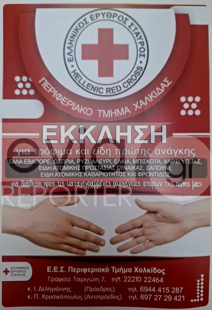Έκκληση προς τους πολίτες απευθύνει το Περιφερειακό Τμήμα Χαλκίδας του Ελληνικού Ερυθρού Σταυρού, καλώντας σε στήριξη των οικονομικά αδύναμων οικογενειών της πόλης με τη συγκέντρωση τροφίμων και ειδών πρώτης ανάγκης.