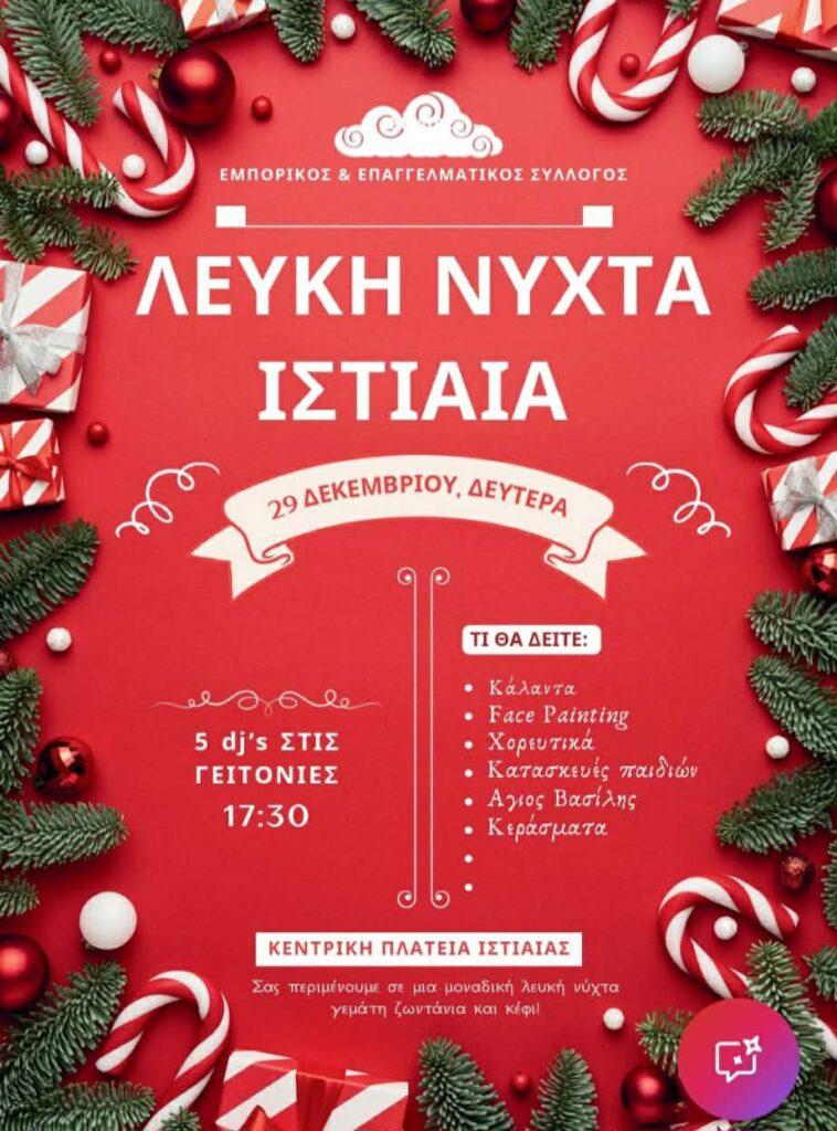 Σε εορταστικούς ρυθμούς κινείται η Ιστιαία τη Δευτέρα 29 Δεκεμβρίου, με τη «Λευκή Νύχτα» να μετατρέπει το κέντρο της πόλης σε έναν μεγάλο χώρο γιορτής, χαράς και δημιουργικής συνύπαρξης. Τη διοργάνωση υπογράφει ο Εμπορικός και Επαγγελματικός Σύλλογος Ιστιαίας, με τη συμμετοχή δεκάδων συλλόγων, σχολών χορού και φορέων της περιοχής.
