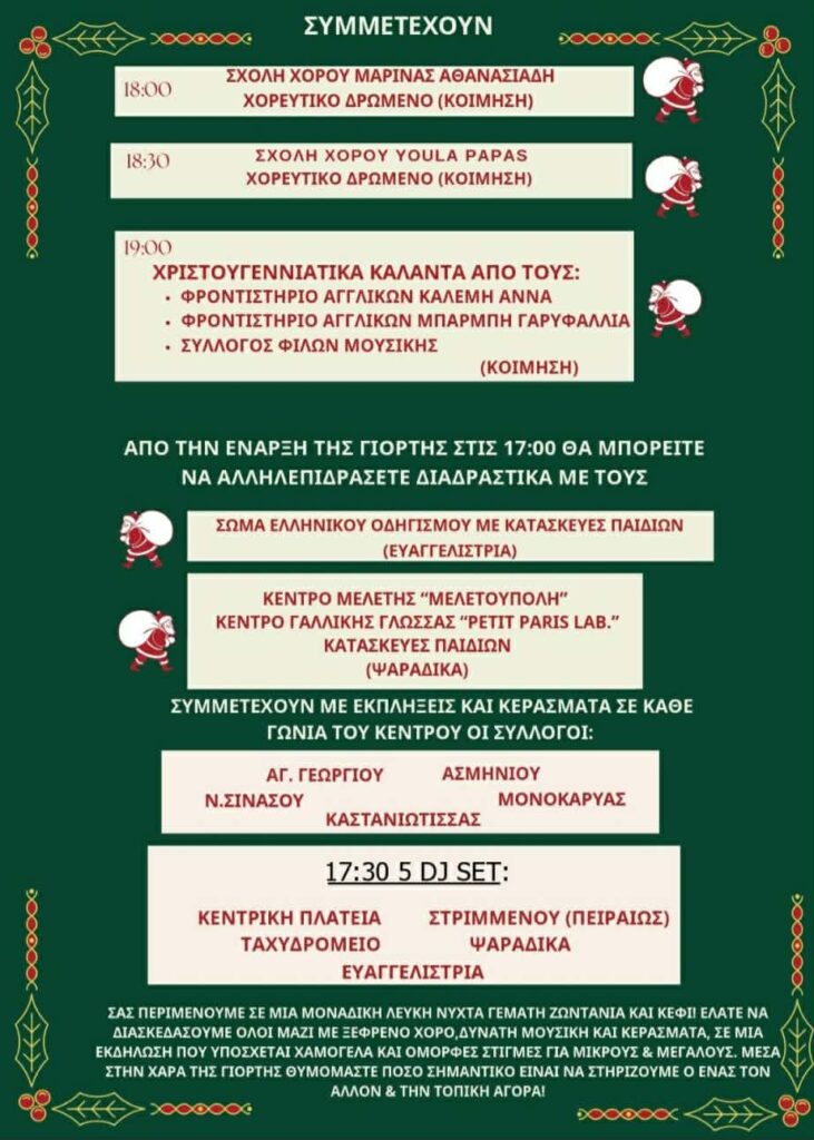Το πρόγραμμα περιλαμβάνει χορευτικά δρώμενα από σχολές χορού, χριστουγεννιάτικα κάλαντα από φροντιστήρια και μουσικούς συλλόγους, face painting, κεράσματα, αλλά και την παρουσία του Άγιου Βασίλη, δημιουργώντας ένα σκηνικό γιορτής για όλη την οικογένεια. Παράλληλα, πολιτιστικοί σύλλογοι από διάφορες περιοχές συμμετέχουν με εκπλήξεις και φιλοξενία σε κάθε γωνιά του κέντρου.