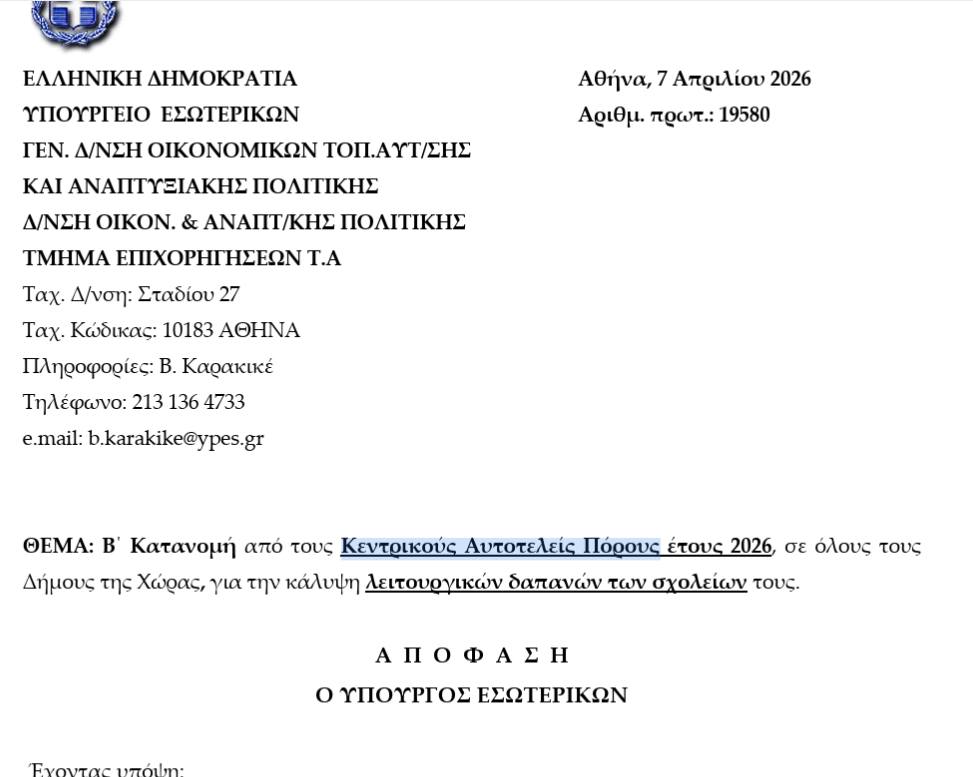 Όπως αναφέρει, οι πόροι αυτοί προέρχονται από φορολογικά έσοδα, όπως ο φόρος εισοδήματος και ο ΦΠΑ, και αποδίδονται στους Δήμους και τις Περιφέρειες για την κάλυψη λειτουργικών και επενδυτικών αναγκών, βάσει αποφάσεων του Υπουργείου Εσωτερικών.
