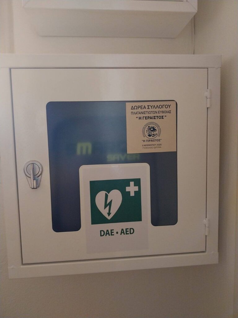 Η συγκεκριμένη δωρεά πραγματοποιήθηκε από τον Πολιτιστικό Σύλλογο Πλατανιστού «ΓΕΡΑΙΣΤΟΣ» και αφορά την κάλυψη του τελευταίου χώρου συνάθροισης κοινού στην Κάρυστο, ολοκληρώνοντας τον στόχο που είχε θέσει η Κοινότητα για τη δημιουργία ενός ολοκληρωμένου δικτύου βασικού εξοπλισμού άμεσης καρδιοπνευμονικής υποστήριξης.