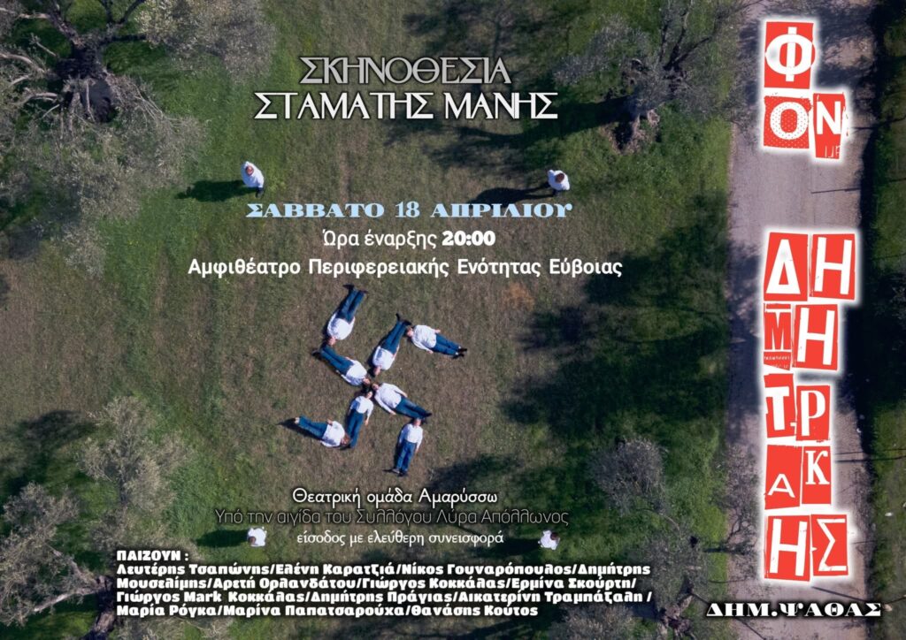 Η παράσταση θα πραγματοποιηθεί σήμερα, Σάββατο 18 Απριλίου, στις 20:00, στο Αμφιθέατρο της Περιφερειακής Ενότητας Εύβοιας (Λεωφόρος Χαϊνά 93).