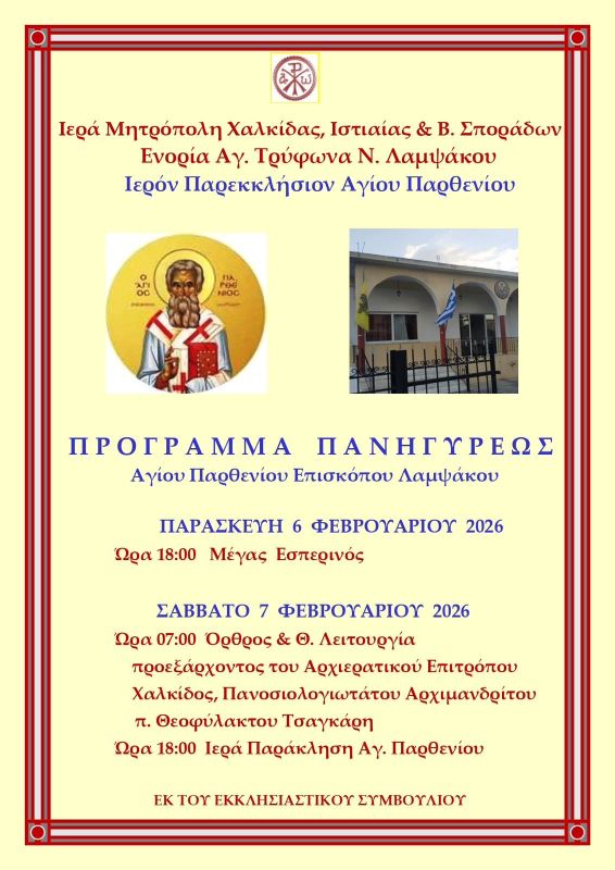 Την Παρασκευή 6 Φεβρουαρίου 2026, στις 18:00, θα τελεστεί ο Μέγας Εσπερινός προς τιμήν του Αγίου Παρθενίου.