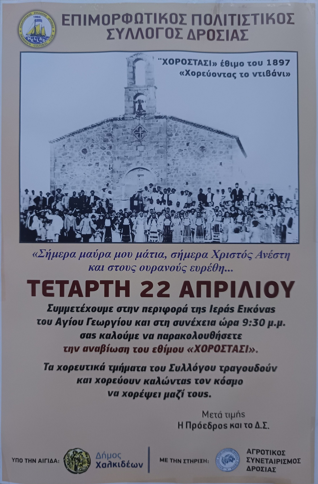 Μια ξεχωριστή βραδιά γεμάτη παράδοση, συγκίνηση και αυθεντικό ελληνικό χρώμα θα πραγματοποιηθεί την Τετάρτη 22 Απριλίου στη Δροσιά, στο πλαίσιο του εορτασμού του Αγίου Γεωργίου.