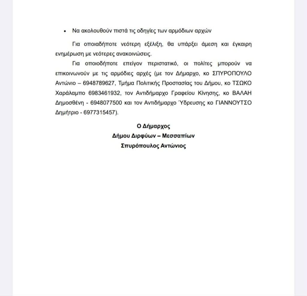 Για οποιαδήποτε νεότερη εξέλιξη, θα υπάρξει άμεση και έγκαιρη ενημέρωση με νέες ανακοινώσεις, ενώ για επείγοντα περιστατικά οι πολίτες μπορούν να επικοινωνούν με τις αρμόδιες δημοτικές υπηρεσίες και τα στελέχη Πολιτικής Προστασίας του Δήμου όπως αναφέρονται παρακάτω στο δελτίο τύπου.