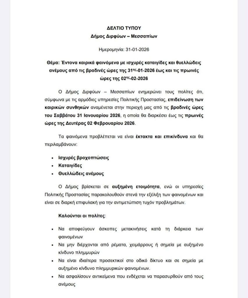 Σε κατάσταση αυξημένης ετοιμότητας βρίσκεται ο Δήμος Διρφύων – Μεσσαπίων, ενόψει της επιδείνωσης των καιρικών συνθηκών που αναμένεται από τις βραδινές ώρες του Σαββάτου 31 Ιανουαρίου 2026 έως και τις πρωινές ώρες της Δευτέρας 2 Φεβρουαρίου 2026, σύμφωνα με τις αρμόδιες υπηρεσίες Πολιτικής Προστασίας.