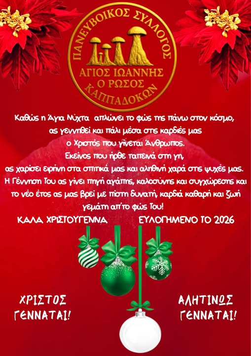 Με λόγια βαθιάς πίστης, μνήμης και ελπίδας, ο Πανευβοϊκός Σύλλογος Καππαδοκών «Άγιος Ιωάννης ο Ρώσος» απευθύνει τις χριστουγεννιάτικες ευχές του σε όλους, με αφορμή τη Γέννηση του Χριστού.