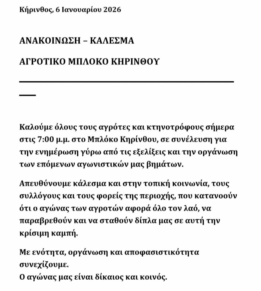 Η συνέλευση θα πραγματοποιηθεί στις 7:00 το απόγευμα στο μπλόκο Κηρίνθου, ενώ κάλεσμα απευθύνεται και προς την τοπική κοινωνία, συλλόγους και φορείς που αναγνωρίζουν ότι ο αγώνας του αγροτικού κόσμου αφορά συνολικά την κοινωνία.