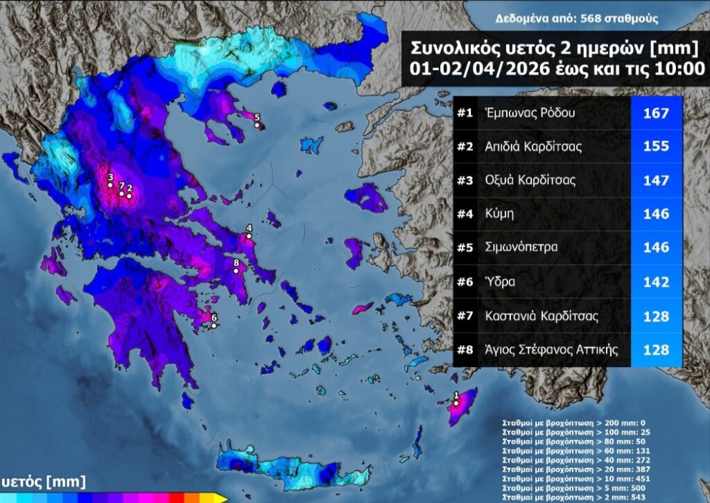 Η ποσότητα αυτή αντιστοιχεί σε περίπου 146 λίτρα νερού ανά τετραγωνικό μέτρο, γεγονός που κατατάσσει τη συγκεκριμένη καταιγίδα στις ιδιαίτερα έντονες και επικίνδυνες περιπτώσεις βροχόπτωσης.