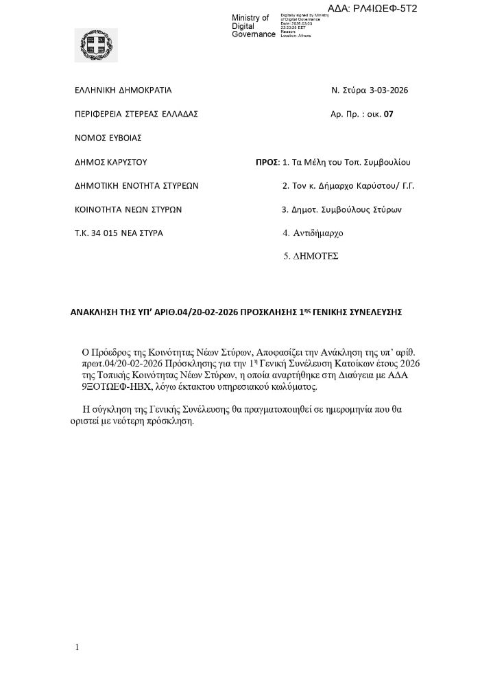 Η απόφαση αφορά την ανάκληση της πρόσκλησης με αριθμό πρωτοκόλλου 04/20-02-2026, η οποία είχε εκδοθεί για τη σύγκληση της συνέλευσης μέσα στο 2026 και είχε αναρτηθεί στη «Διαύγεια».