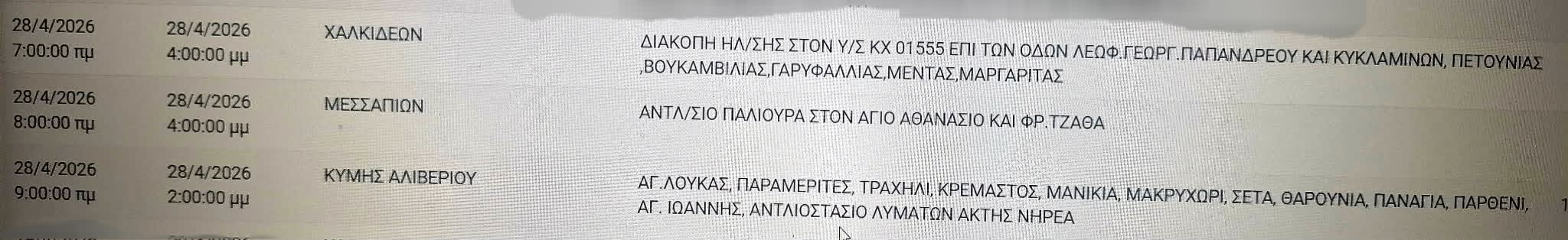 Προκειμένου να προγραμματίσετε τις εργασίες σας και να ελαχιστοποιηθεί η όχλησή σας, στον ακόλουθο πίνακα, μπορείτε να ενημερωθείτε για τις περιοχές και τις ώρες προγραμματισμένων διακοπών ηλεκτροδότησης στην Εύβοια την Τρίτη 28/4.