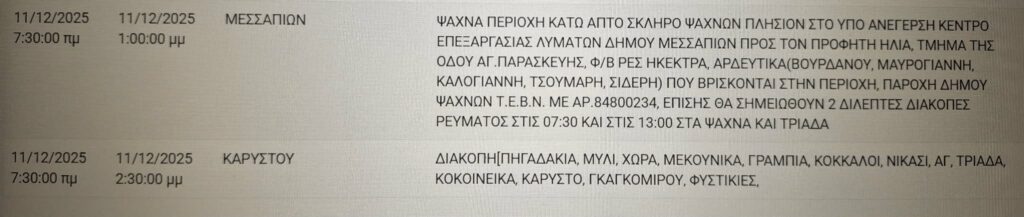 Προκειμένου να προγραμματίσετε τις εργασίες σας και να ελαχιστοποιηθεί η όχλησή σας, στον ακόλουθο πίνακα, μπορείτε να ενημερωθείτε για τις περιοχές και τις ώρες προγραμματισμένων διακοπών ηλεκτροδότησης στην Εύβοια την Πέμπτη 11/12.