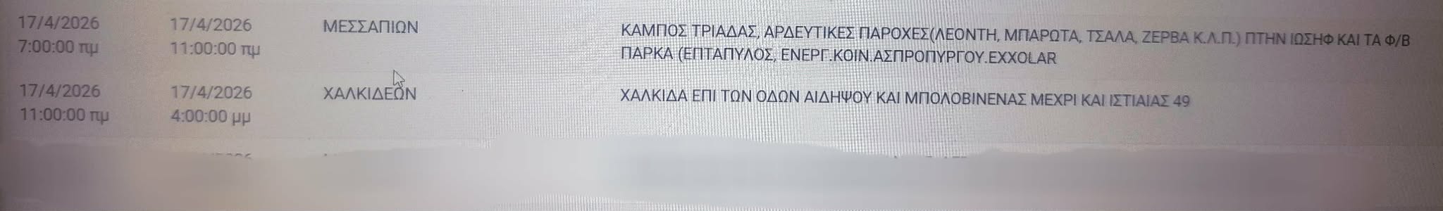 Προκειμένου να προγραμματίσετε τις εργασίες σας και να ελαχιστοποιηθεί η όχλησή σας, στον ακόλουθο πίνακα, μπορείτε να ενημερωθείτε για τις περιοχές και τις ώρες προγραμματισμένων διακοπών ηλεκτροδότησης στην Εύβοια την Παρασκευή 17/4.