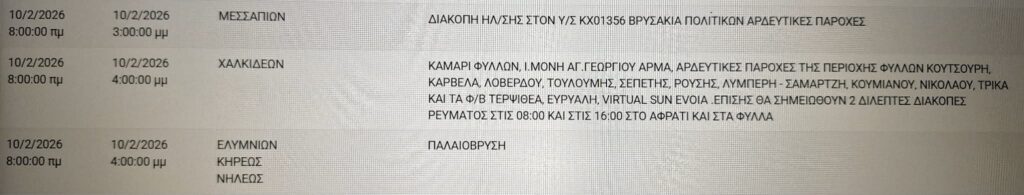 Εύβοια: Διακοπή ρεύματος την Τρίτη 10/2 σε αυτές τις περιοχές – Αναλυτικός Πίνακας