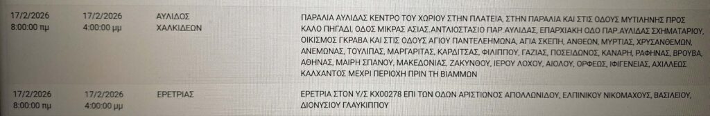 Εύβοια: Διακοπή ρεύματος την Τρίτη 17/2 σε δεκάδες περιοχές – Αναλυτικός πίνακας