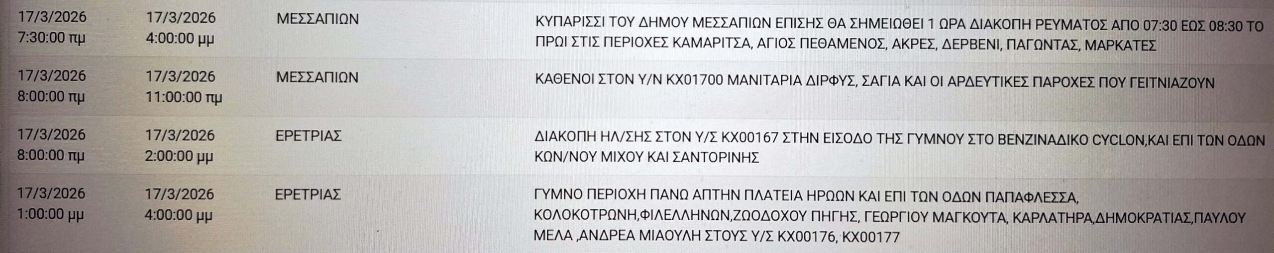 Προκειμένου να προγραμματίσετε τις εργασίες σας και να ελαχιστοποιηθεί η όχλησή σας, στον ακόλουθο πίνακα, μπορείτε να ενημερωθείτε για τις περιοχές και τις ώρες προγραμματισμένων διακοπών ηλεκτροδότησης στην Εύβοια την Τρίτη 17/3.
