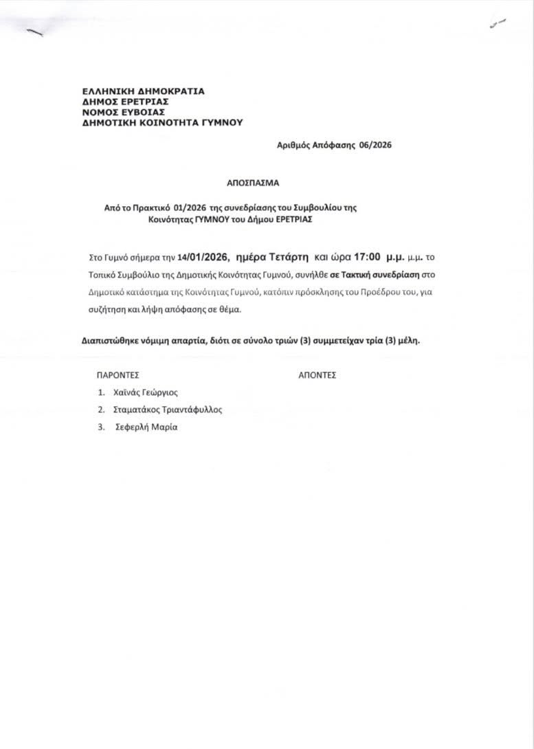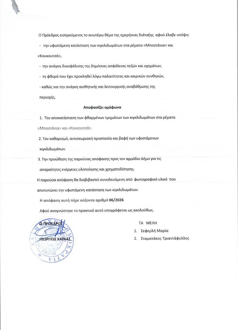 Σύμφωνα με το σχετικό πρακτικό, το Συμβούλιο συνεδρίασε και έλαβε ομόφωνα την υπ’ αριθμ. 06/2026 απόφαση, με βασικό αντικείμενο την αποκατάσταση φθορών στα κιγκλιδώματα των ρεμάτων «Μποστάνια» και «Κουκουτσά».