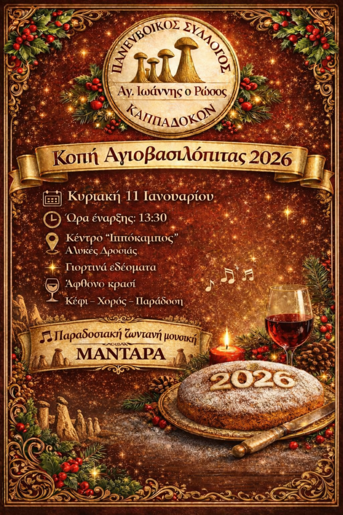 Ο Πανευβοϊκός Σύλλογος Καππαδοκών «Άγιος Ιωάννης ο Ρώσος» προσκαλεί τα μέλη και τους φίλους του στην ετήσια κοπή της πρωτοχρονιάτικης πίτας του, την Κυριακή 11 Ιανουαρίου 2026 και ώρα 13:30, στο κέντρο «Ιππόκαμπος», στις Αλυκές Δροσιάς.