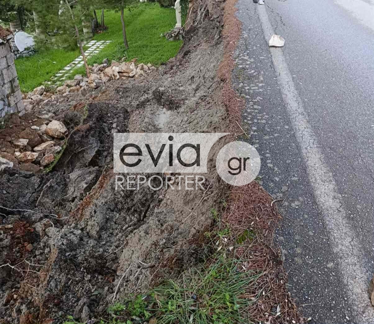 Από την κατάρρευση, χώματα και πέτρες κατέληξαν δίπλα στον δρόμο, ενώ παρατηρήθηκε και καθίζηση του εδάφους.