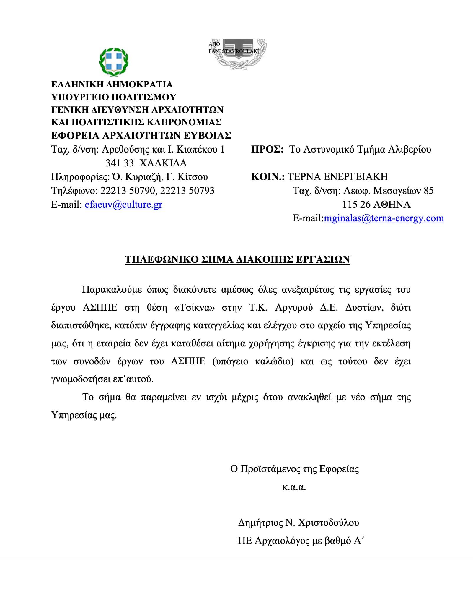 Την άμεση παύση εργασιών σε έργο στην περιοχή «Τσίγκα» της Τ.Κ. Αργυρού, στη Δ.Ε. Δυστίων, ζητά η Εφορεία Αρχαιοτήτων Εύβοιας, σύμφωνα με επίσημο έγγραφο.