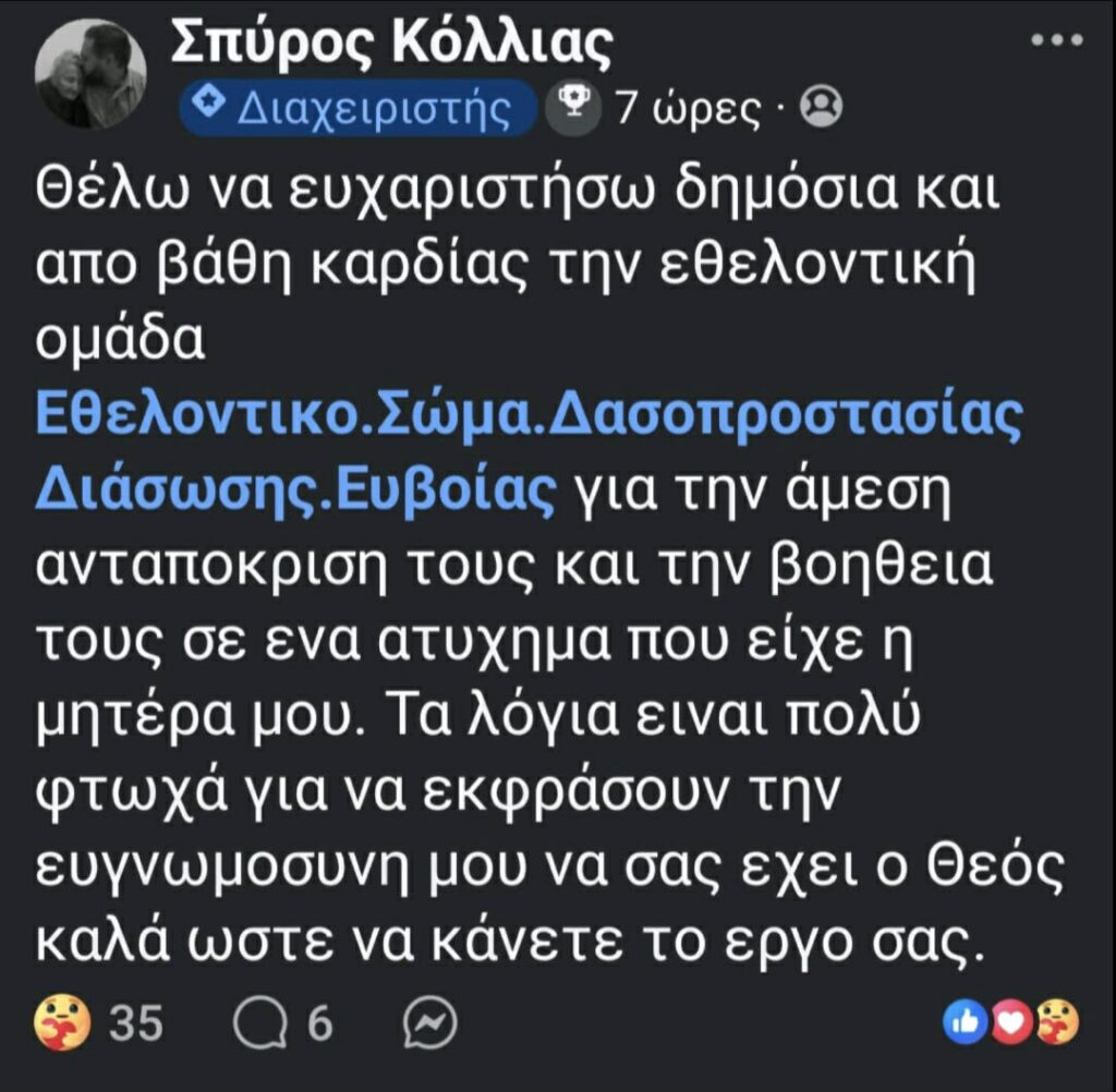 Ένα δημόσιο και ιδιαίτερα συγκινητικό μήνυμα ευγνωμοσύνης προς τους εθελοντές του Εθελοντικού Σώματος Δασοπροστασίας Διάσωσης Εύβοιας δημοσίευσε στα μέσα κοινωνικής δικτύωσης πολίτης, θέλοντας να ευχαριστήσει την ομάδα για την άμεση ανταπόκριση και τη βοήθεια που προσέφερε σε ατύχημα που είχε η μητέρα του.