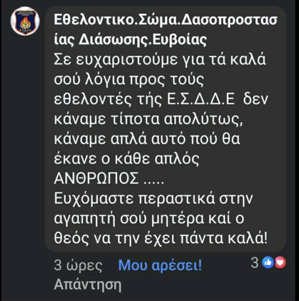Από την πλευρά τους, οι εθελοντές απάντησαν με σεμνότητα, επισημαίνοντας πως δεν έκαναν τίποτα περισσότερο από αυτό που θα έκανε κάθε απλός άνθρωπος. Στο μήνυμά τους ευχήθηκαν επίσης περαστικά στη μητέρα του πολίτη, εκφράζοντας την ελπίδα να είναι σύντομα καλά.