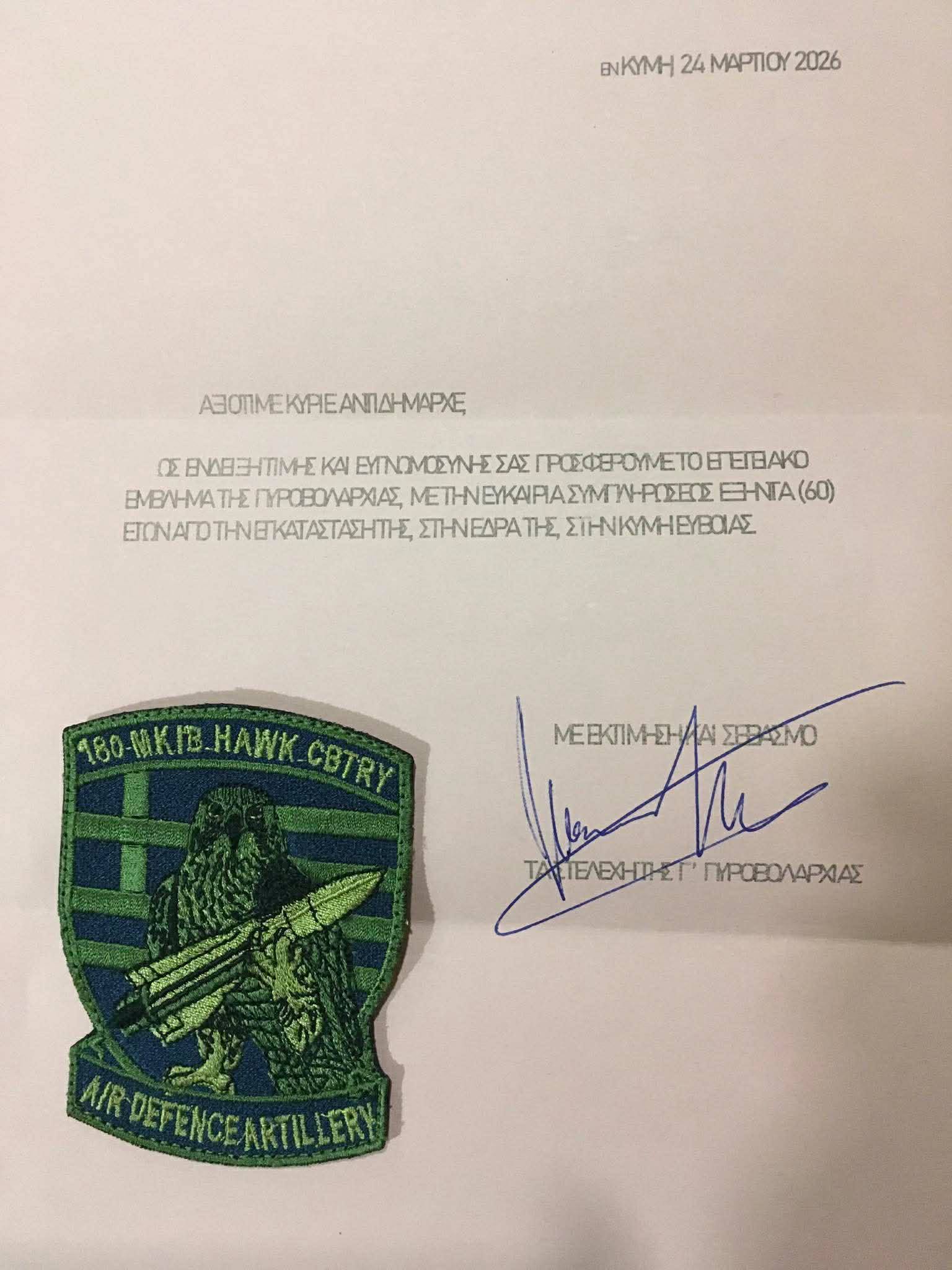 Σε μια ιδιαίτερα συμβολική στιγμή, παραμονή της εθνικής επετείου της 25ης Μαρτίου, απονεμήθηκε τιμητικό έμβλημα στον Αντιδήμαρχο Δ.Ε. Κύμης Αργύρη Πάφρα από στελέχη της Γ’ Πυροβολαρχίας της Μονάδας ΧΩΚ 180 ΜΚ/Β του Στρατοπέδου Κύμης.