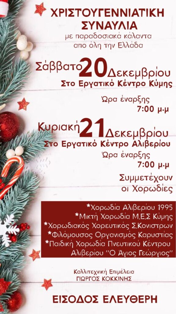 Μια ξεχωριστή Χριστουγεννιάτικη μουσική βραδιά με κάλαντα από κάθε γωνιά της Ελλάδας ετοιμάζουν το Σαββατοκύριακο 20-21 Δεκεμβρίου στο Εργατικό Κέντρο Κύμης, οι χορωδίες της περιοχής, δημιουργώντας ένα γιορτινό μωσαϊκό ήχων και παραδόσεων.