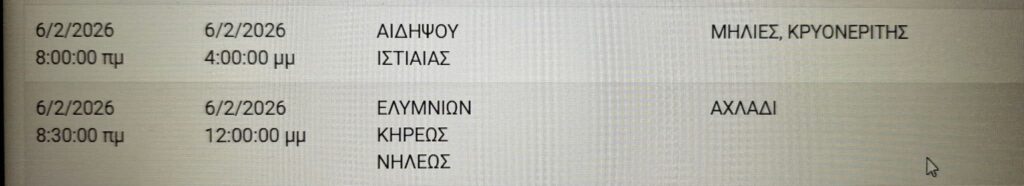 Προκειμένου να προγραμματίσετε τις εργασίες σας και να ελαχιστοποιηθεί η όχλησή σας, στον ακόλουθο πίνακα, μπορείτε να ενημερωθείτε για τις περιοχές και τις ώρες προγραμματισμένων διακοπών ηλεκτροδότησης στην Εύβοια την Παρασκευή 6/2.