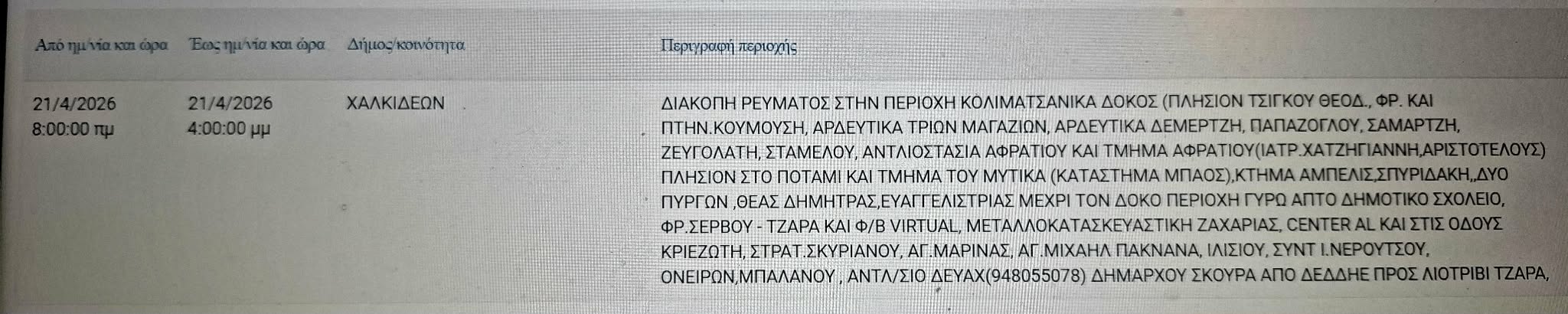 Προκειμένου να προγραμματίσετε τις εργασίες σας και να ελαχιστοποιηθεί η όχλησή σας, στον ακόλουθο πίνακα, μπορείτε να ενημερωθείτε για τις περιοχές και τις ώρες προγραμματισμένων διακοπών ηλεκτροδότησης στην Εύβοια την Τρίτη 21/4.