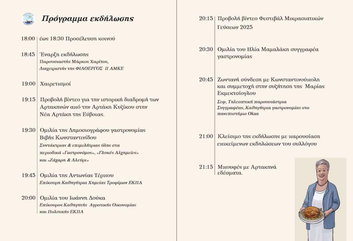 Το πρόγραμμα περιλαμβάνει προβολές βίντεο, ιστορικές αναφορές και εισηγήσεις από δημοσιογράφους, πανεπιστημιακούς και ειδικούς της γαστρονομίας. Μεταξύ άλλων, θα παρουσιαστεί η ιστορική διαδρομή των Αρτακηνών από την Αρτάκη της Κυζίκου στη Νέα Αρτάκη της Εύβοιας, ενώ θα υπάρξουν παρεμβάσεις για τη σημασία της παραδοσιακής κουζίνας στη σύγχρονη ζωή.