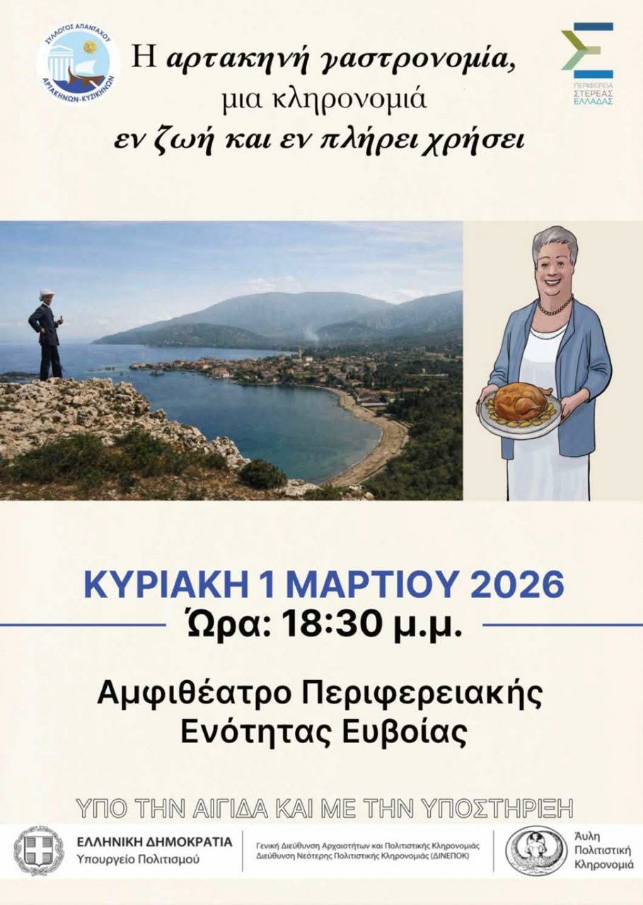 Μια εκδήλωση αφιερωμένη στη ζωντανή γαστρονομική κληρονομιά της Αρτάκης θα πραγματοποιηθεί την Κυριακή 1 Μαρτίου 2026, στις 18:30, στο Αμφιθέατρο Περιφερειακής Ενότητας Εύβοιας, με τίτλο «Η αρτακηνή γαστρονομία, μια κληρονομιά εν ζωή και εν πλήρει χρήσει».