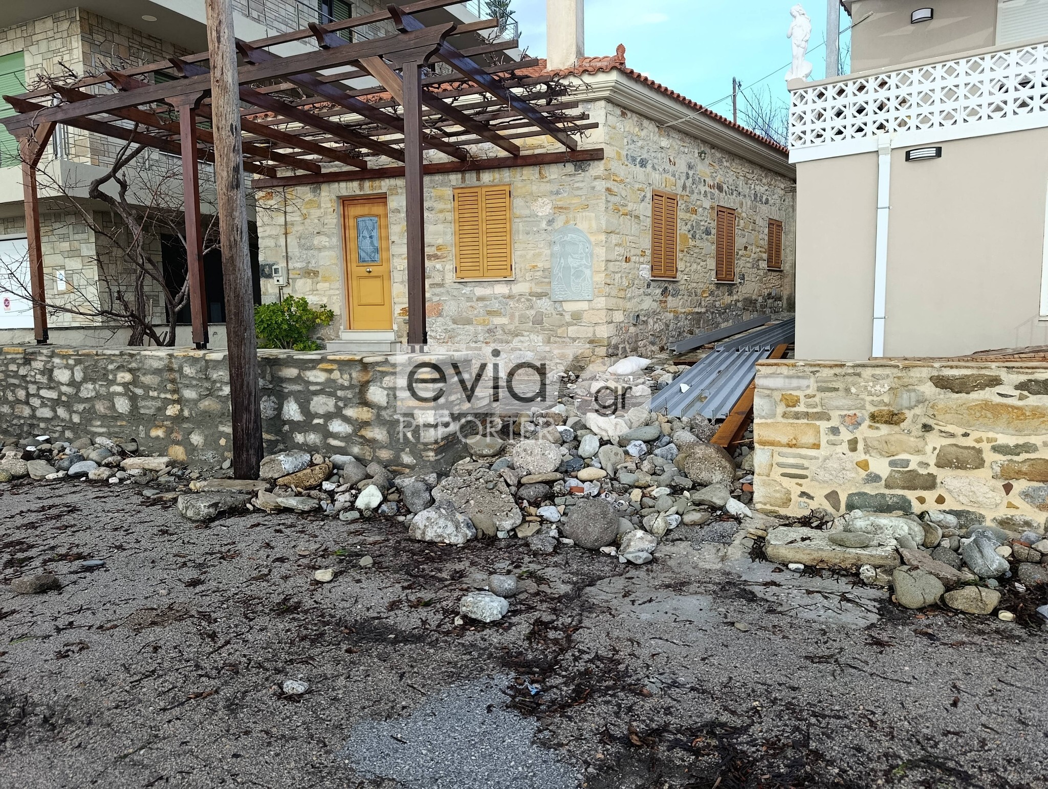 Από τις πρώτες πρωινές ώρες, 12 εργαζόμενοι του Δήμου, με τη συνδρομή μηχανημάτων (φορτωτής-τσάπα JCB και τρακτέρ-σκούπα), επιχειρούν συντονισμένα για την αποκατάσταση της ασφάλειας και την απομάκρυνση επικίνδυνων υλικών από το παραλιακό μέτωπο.