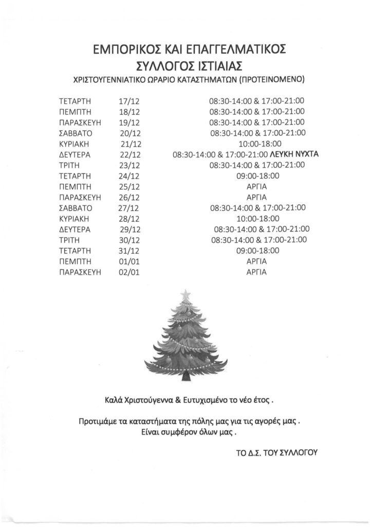 Παράλληλα, ανακοινώθηκε το προτεινόμενο εορταστικό ωράριο των καταστημάτων για την περίοδο των Χριστουγέννων, με στόχο τη διευκόλυνση των καταναλωτών και την ενίσχυση της αγοράς.