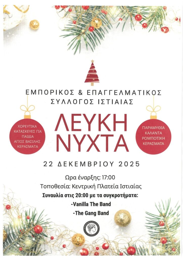 Η Ιστιαία ετοιμάζεται να φορέσει τα γιορτινά της, καθώς η «Λευκή Νύχτα» επιστρέφει δυναμικά τη Δευτέρα 22 Δεκεμβρίου 2025, από τις 17:00, στην κεντρική πλατεία της πόλης. Ο Εμπορικός Επαγγελματικός Σύλλογος Ιστιαίας προσκαλεί κατοίκους και επισκέπτες σε μια μεγάλη γιορτή που θα δώσει τον πιο λαμπερό τόνο στην τοπική αγορά και θα σηματοδοτήσει την κορύφωση της χριστουγεννιάτικης περιόδου.