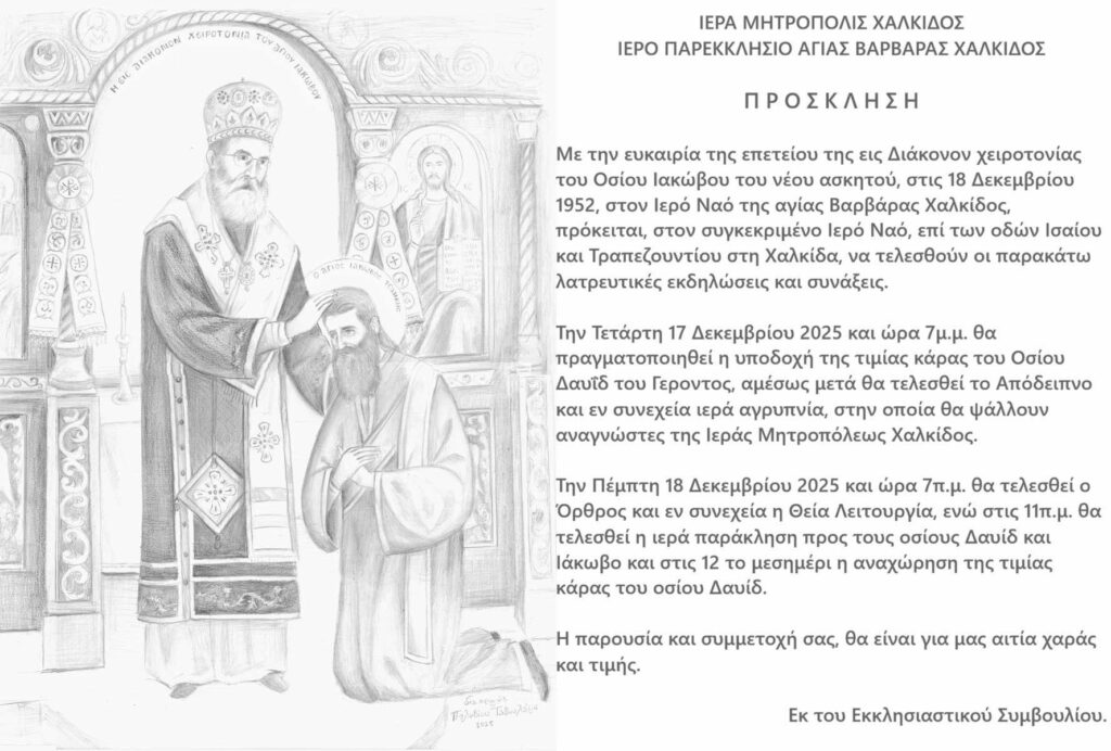Λατρευτικές εκδηλώσεις θα πραγματοποιηθούν την Τετάρτη 17 και την Πέμπτη 18 Δεκεμβρίου 2025 στο Ιερό Παρεκκλήσιο Αγίας Βαρβάρας Χαλκίδας, με αφορμή την επέτειο της εις Διάκονον χειροτονίας του Οσίου Ιακώβου του Νέου Ασκητού, που τελέστηκε στις 18 Δεκεμβρίου 1952.