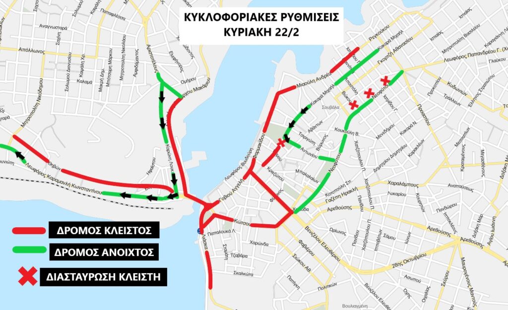 Σύμφωνα με τον σχεδιασμό, από τις 16:00 έως περίπου τις 23:00 θα απαγορεύεται η κυκλοφορία οχημάτων στις οδούς Κώτσου, Παπαναστασίου, Κατσικογιάννη, Ρεγκούκου, Μιαούλη, Τζιαρντίνι, Φαρμακίδου και Αγγελή Γοβιού. Η οδός Νεοφύτου θα περιλαμβάνεται στον δακτύλιο απαγόρευσης, ωστόσο θα παραμένει ανοιχτή μόνο με κατεύθυνση προς τη Λεωφόρο Χαϊνά.