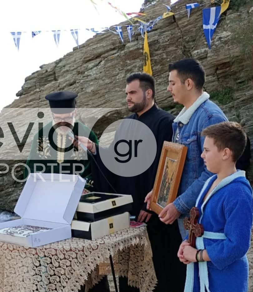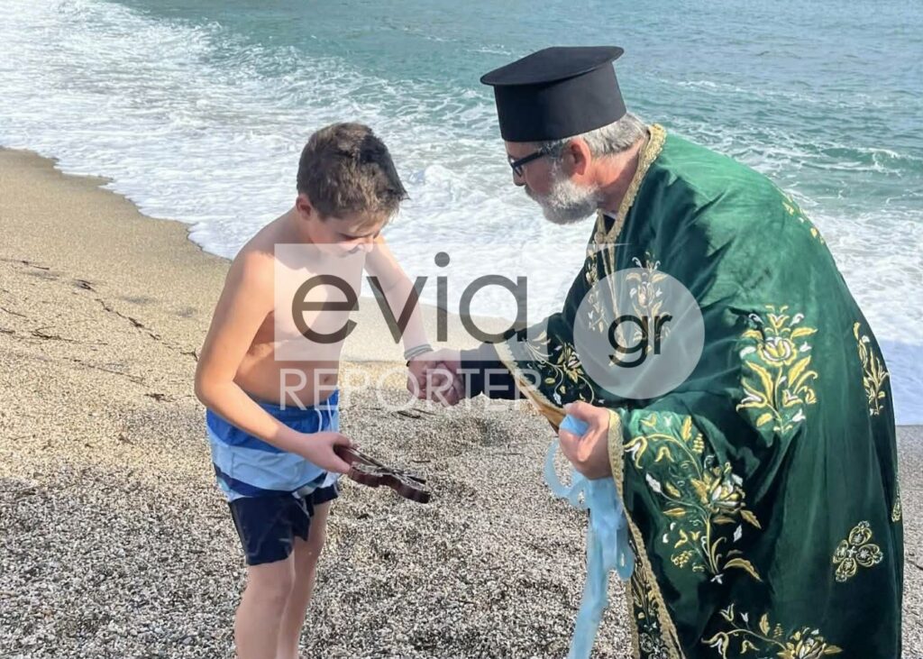 Αμέσως μετά ακολούθησε η καθιερωμένη τελετή της κατάδυσης του Τιμίου Σταυρού στην παραλία του Καλάμου, όπου συγκεντρώθηκε αρκετός κόσμος. Τον Τίμιο Σταυρό ανέσυρε από τα νερά ο 11χρονος Φίλιππος Μπάνος, λαμβάνοντας την ευλογία της ημέρας και το θερμό χειροκρότημα των παρευρισκομένων.