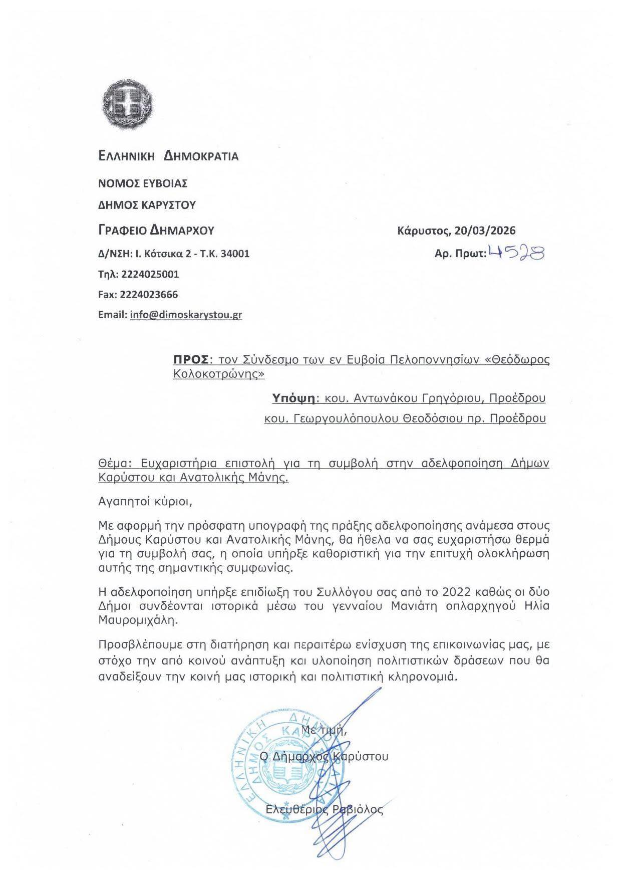Την ικανοποίησή του για τη συμβολή φορέων στην επιτυχή ολοκλήρωση της αδελφοποίησης μεταξύ του Δήμου Καρύστου και του Δήμου Ανατολικής Μάνης εκφράζει με επίσημη επιστολή ο Δήμαρχος Λευτέρης Ραβιόλος.