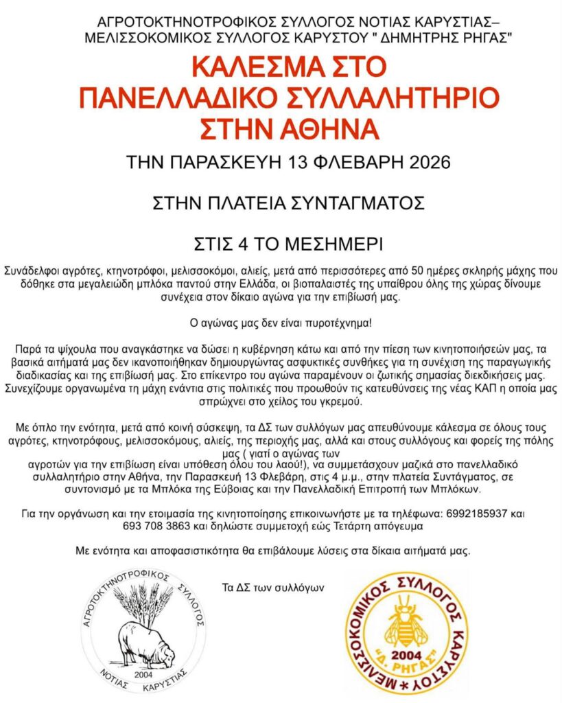 Κάλεσμα μαζικής συμμετοχής στο πανελλαδικό συλλαλητήριο που θα πραγματοποιηθεί στην Αθήνα απευθύνουν ο Αγροτοκτηνοτροφικός Σύλλογος Νότιας Καρυστίας και ο Μελισσοκομικός Σύλλογος Καρύστου «Δημήτρης Ρήγας».