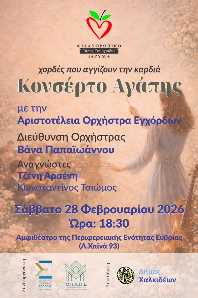 Ένα ξεχωριστό μουσικό γεγονός με έντονο φιλανθρωπικό αποτύπωμα φιλοξενεί η Χαλκίδα το Σάββατο 28 Φεβρουαρίου 2026, με το Κονσέρτο Αγάπης που διοργανώνει το Φιλανθρωπικό Ίδρυμα Τ. Γεωργιάδης.