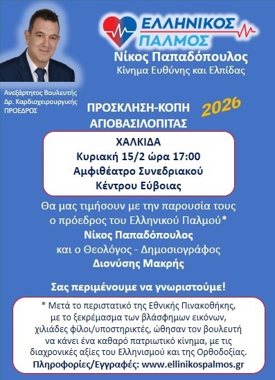 Την κοπή της βασιλόπιτάς του για το 2026 πραγματοποιεί στη Χαλκίδα το πολιτικό κίνημα Ελληνικός Παλμός, προσκαλώντας φίλους και υποστηρικτές σε μια ανοιχτή πολιτική εκδήλωση γνωριμίας και διαλόγου.