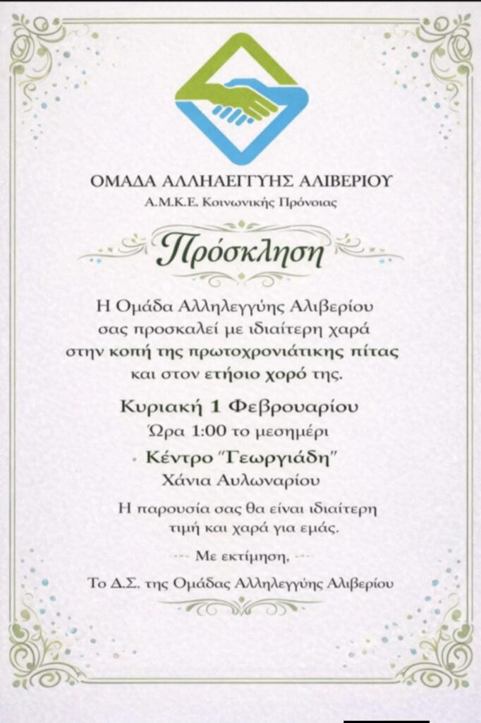 Η παρουσία του κόσμου αποτελεί ιδιαίτερη τιμή για τα μέλη της Ομάδας Αλληλεγγύης, η οποία διαχρονικά στηρίζει ευάλωτες κοινωνικές ομάδες και αναπτύσσει δράσεις κοινωνικής προσφοράς στην ευρύτερη περιοχή του Αλιβερίου. Η εκδήλωση θα αποτελέσει ευκαιρία για ανταλλαγή ευχών για τη νέα χρονιά, αλλά και για ενίσχυση του πνεύματος συνεργασίας και αλληλεγγύης που χαρακτηρίζει το έργο της Ομάδας.