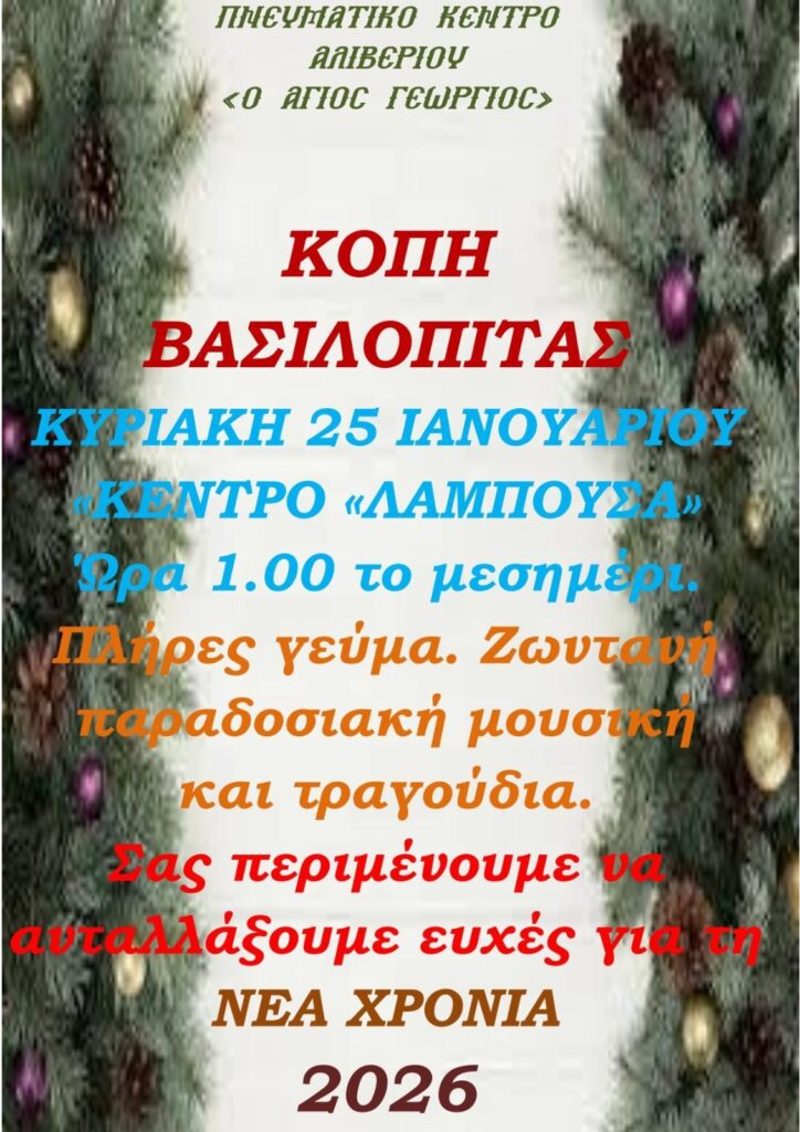 Την πρωτοχρονιάτικη πίτα του θα κόψει το Πνευματικό Κέντρο Αλιβερίου «Άγιος Γεώργιος» την Κυριακή 25 Ιανουαρίου, στις 13:00 το μεσημέρι, στο κέντρο «Λαμπούσα».