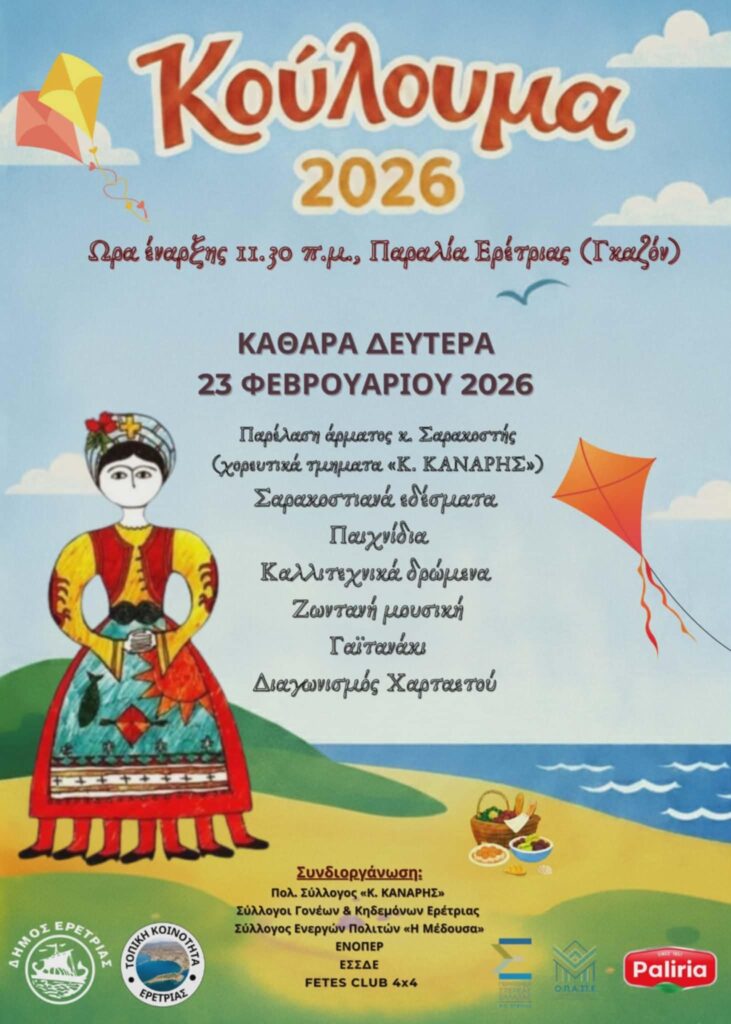 Με χρώματα, μουσική και έντονο αποκριάτικο άρωμα θα γιορταστούν τα Κούλουμα 2026 στην Ερέτρια, την Καθαρά Δευτέρα 23 Φεβρουαρίου, στην παραλία της πόλης (Γκαζόν), με ώρα έναρξης στις 11:30 το πρωί.