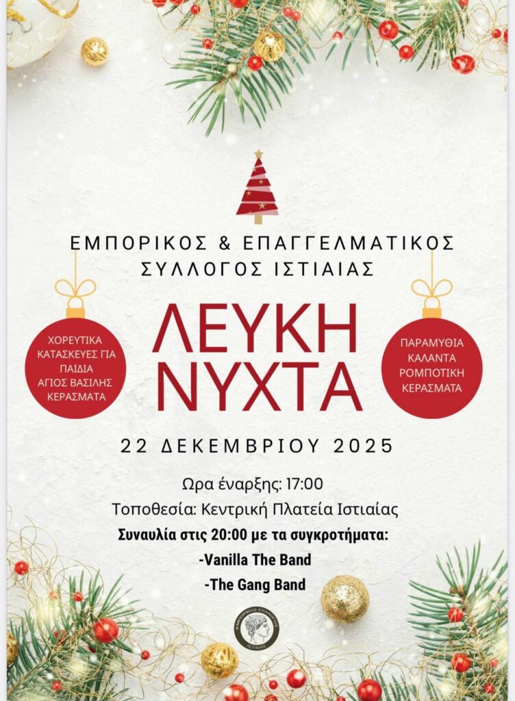 Τη δική της ξεχωριστή γιορτινή βραδιά ετοιμάζεται να ζήσει η Ιστιαία τη Δευτέρα 22 Δεκεμβρίου 2025, με τη διοργάνωση της «Λευκής Νύχτας» από τον Εμπορικό & Επαγγελματικό Σύλλογο Ιστιαίας.