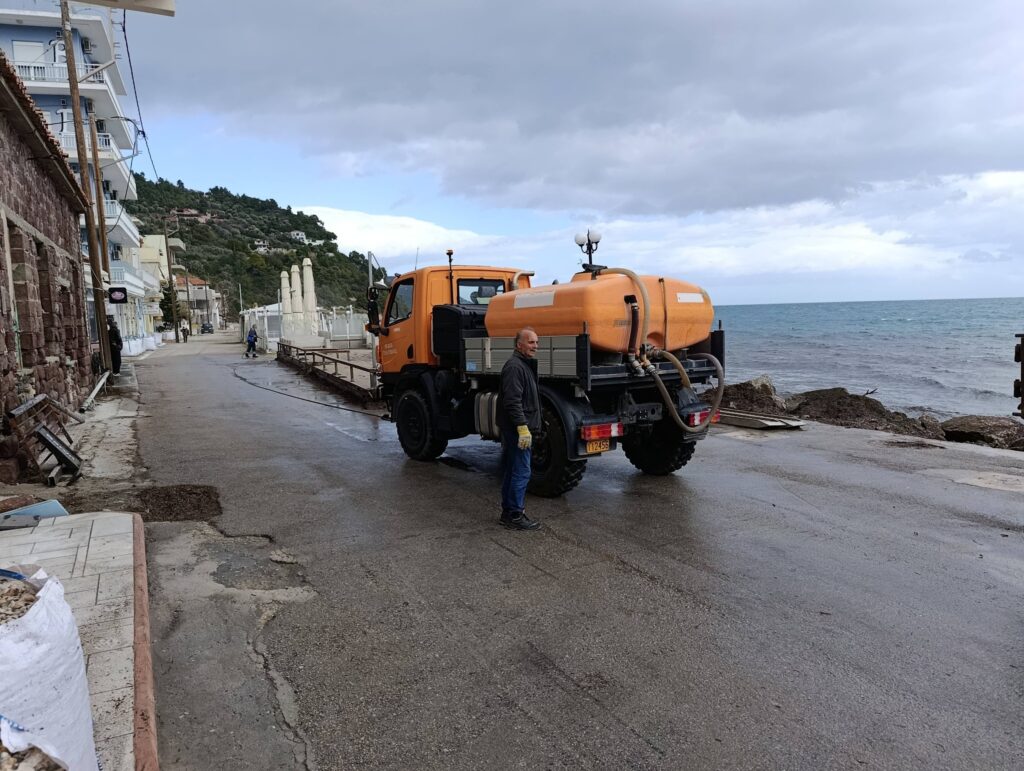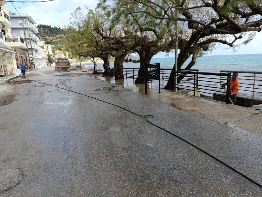 Παράλληλα, πραγματοποιήθηκε πλύσιμο των δρόμων με πιεστικά μηχανήματα, καθώς και καθαρισμός του ρέματος της παραλίας, με την απομάκρυνση φερτών υλικών, ώστε να διασφαλιστεί η ομαλή απορροή των υδάτων και η ασφάλεια της περιοχής.