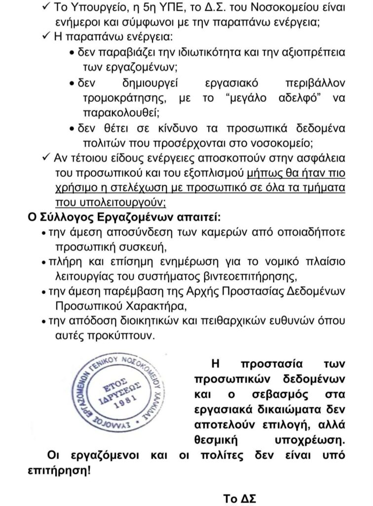 Παράλληλα, επισημαίνεται ο κίνδυνος δημιουργίας κλίματος εκφοβισμού στον χώρο εργασίας, καθώς και η πιθανή έκθεση προσωπικών δεδομένων πολιτών που επισκέπτονται το Νοσοκομείο. Οι εργαζόμενοι υπογραμμίζουν ότι, αν στόχος είναι η ασφάλεια, προτεραιότητα θα έπρεπε να είναι η ενίσχυση της στελέχωσης στα τμήματα που υπολειτουργούν.