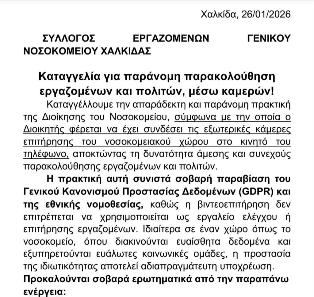 Σε δημόσια καταγγελία για παράνομη παρακολούθηση εργαζομένων και πολιτών μέσω καμερών προχώρησε ο Σύλλογος Εργαζομένων του Γενικού Νοσοκομείου Χαλκίδας, θέτοντας σοβαρά ζητήματα νομιμότητας, προστασίας προσωπικών δεδομένων και εργασιακών δικαιωμάτων.