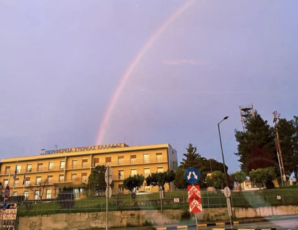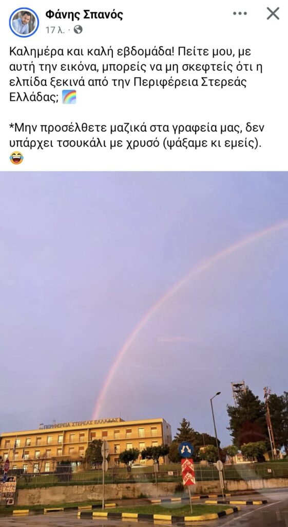 Μια καλημέρα με χαμόγελο και δόση… λαογραφίας επέλεξε να πει ο Φάνης Σπανός, μέσα από ανάρτησή του στα μέσα κοινωνικής δικτύωσης. Αφορμή, ένα εντυπωσιακό ουράνιο τόξο που σχηματίστηκε πάνω από το κτήριο της Περιφέρειας Στερεάς Ελλάδας, δημιουργώντας μια εικόνα που δεν περνά απαρατήρητη.